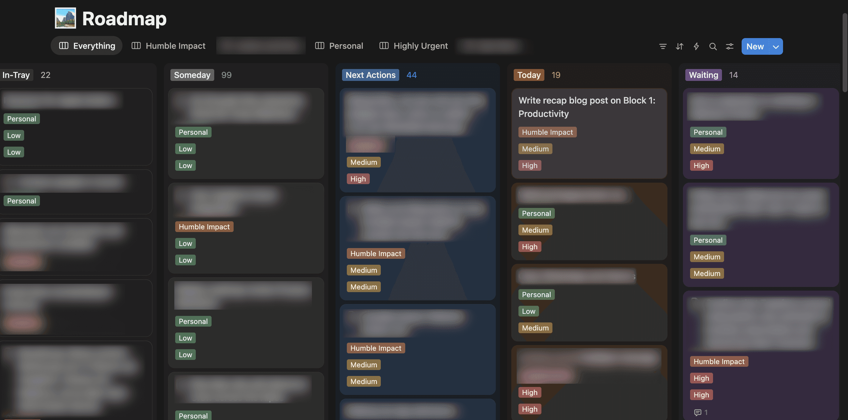 Notion allows you to create different board views by applying filters; for example, I have a different board view for the actions of each of the main segments I'd like to look at individually, as well as one board view for all highly urgent actions.